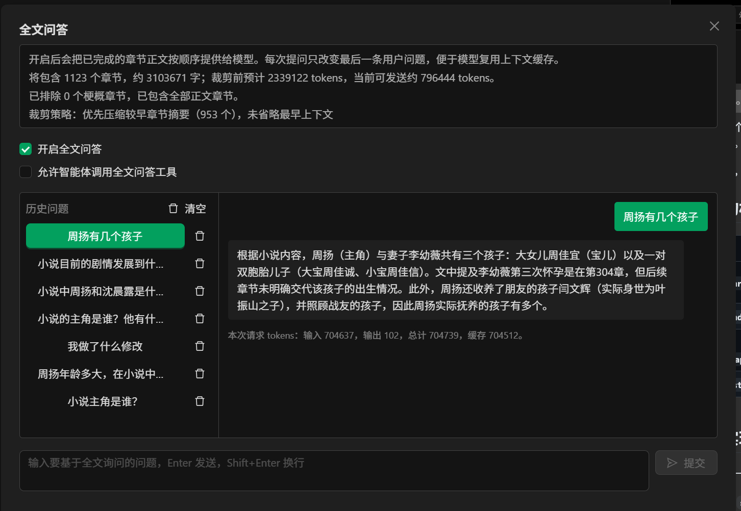 而且总要的是,我们针对性地基于 DeepSeek 强大的缓存能力,尽量地降低积分的消耗,即便是百万字的问答,在有缓存优化的情况下,一次问答也只需要消耗不到两百万积分。对于二三十万字的小说,消耗就更少了。即便是内容有新增或者修改,我们也会尽量保证缓存的可靠性,尽可能降低积分消耗。