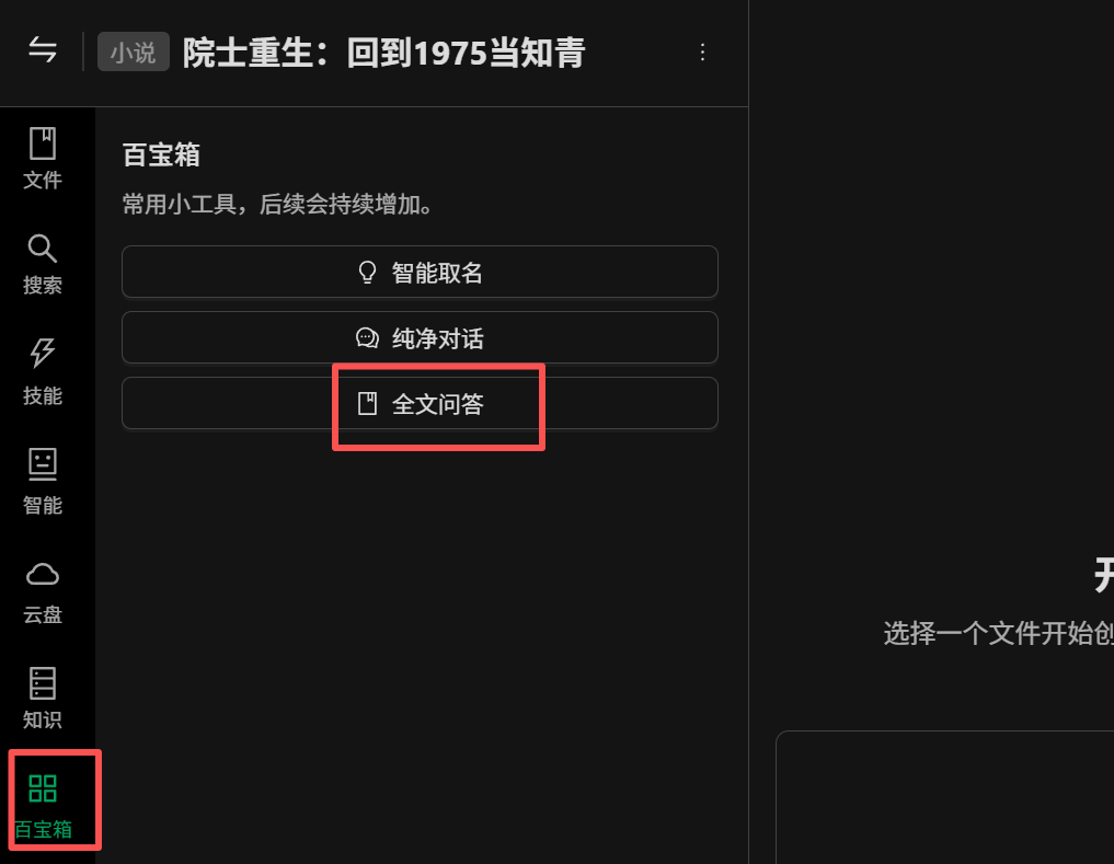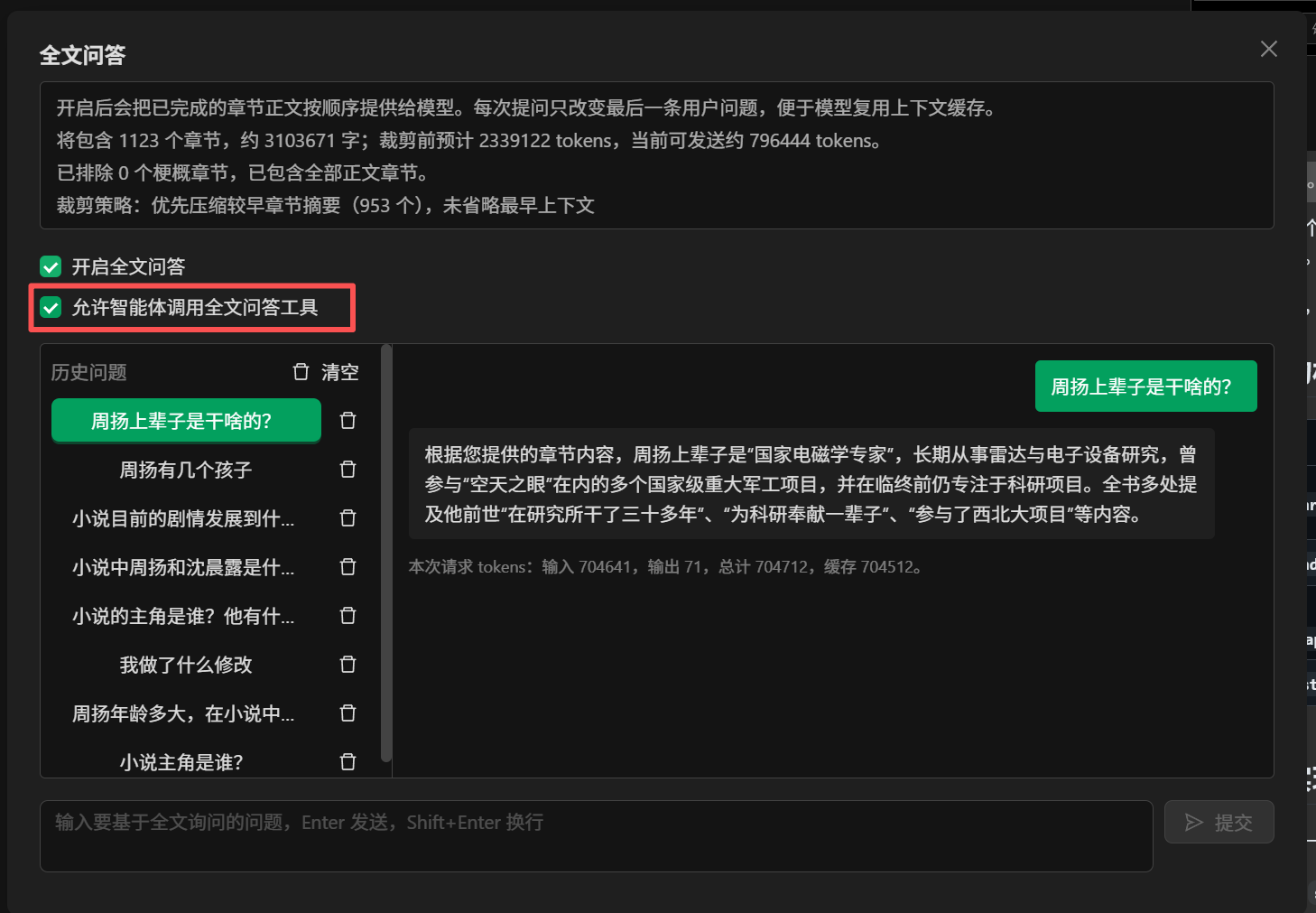 而且,这个能力有一个很大的用处,就是可以在智能体中调用,用于拆书分析或者创作的时候让智能体可以更好地获取到小说全局相关信息。只要勾选上“允许智能体调用全文问答工具”即可: