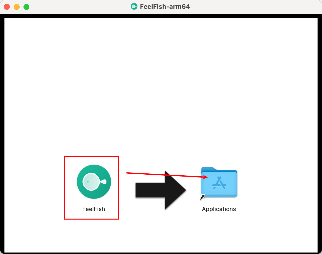苹果电脑需要拖动 FeelFish 到应用文件夹来安装,如下图: