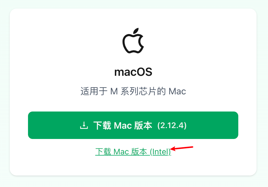 另外苹果电脑注意选择正确的版本安装,如果是老款电脑(几年前的非 M 系列芯片),需要选择 Intel 版本安装。
