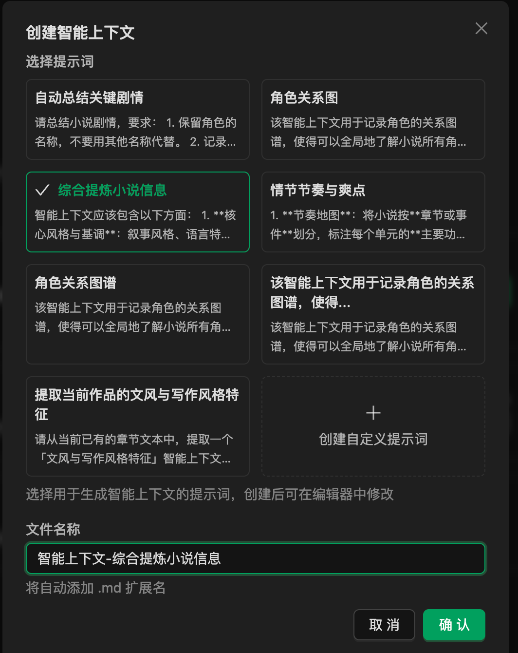 - 多个智能上下文时请使用有意义的名称 - 这样方便 AI 通过文件名就大概知道智能上下文的用途,比如 “智能上下文-角色关系图”这样的名字。