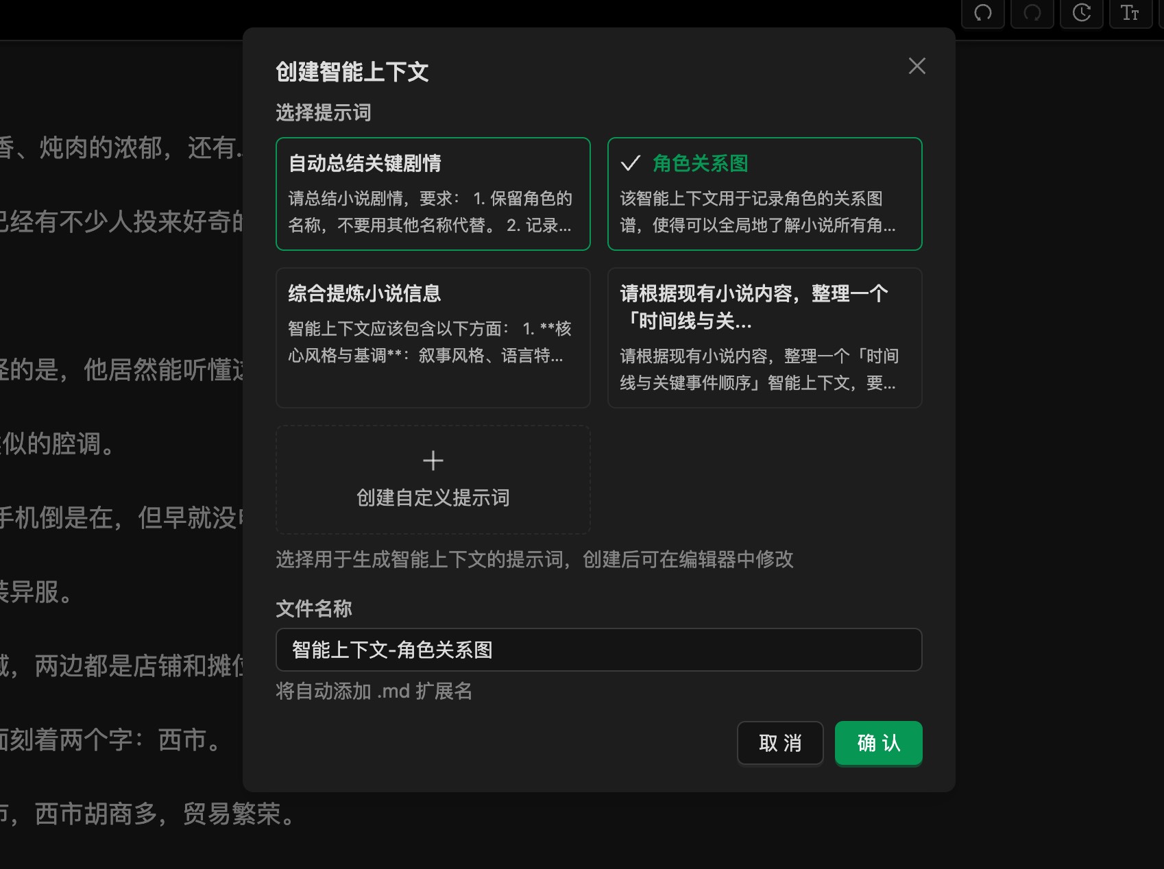 - 专业辅助模式下使用 FeelFish 的智能上下文功能,基于已有内容提取信息,如下图1,如何提取信息你都可以通过自定义提示词来调整