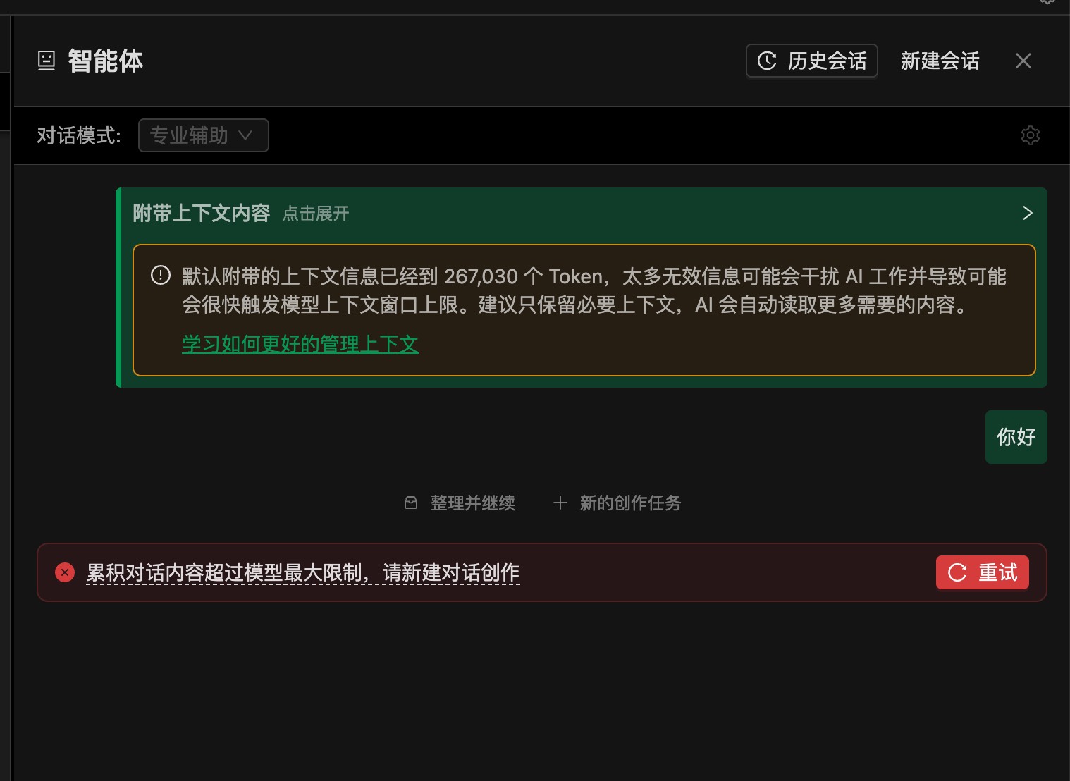 如果对话没有持续很长,甚至第一条消息就出现这个错误,那说明默认携带的文件内容太多了。建议参考上面“我应该添加哪些文件到上下文中?”的说明,减少默认携带的文件内容。建议选择“全部规则”即可。可以通过构建类似“角色关系图”这样的智能上下文来帮助 AI 全局了解全局信息,用少量的上下文内容就可以完成创作任务。