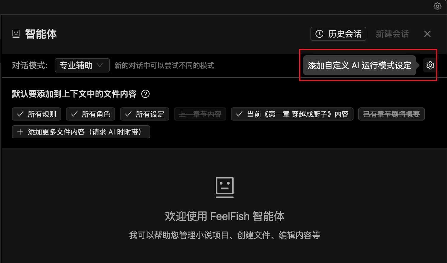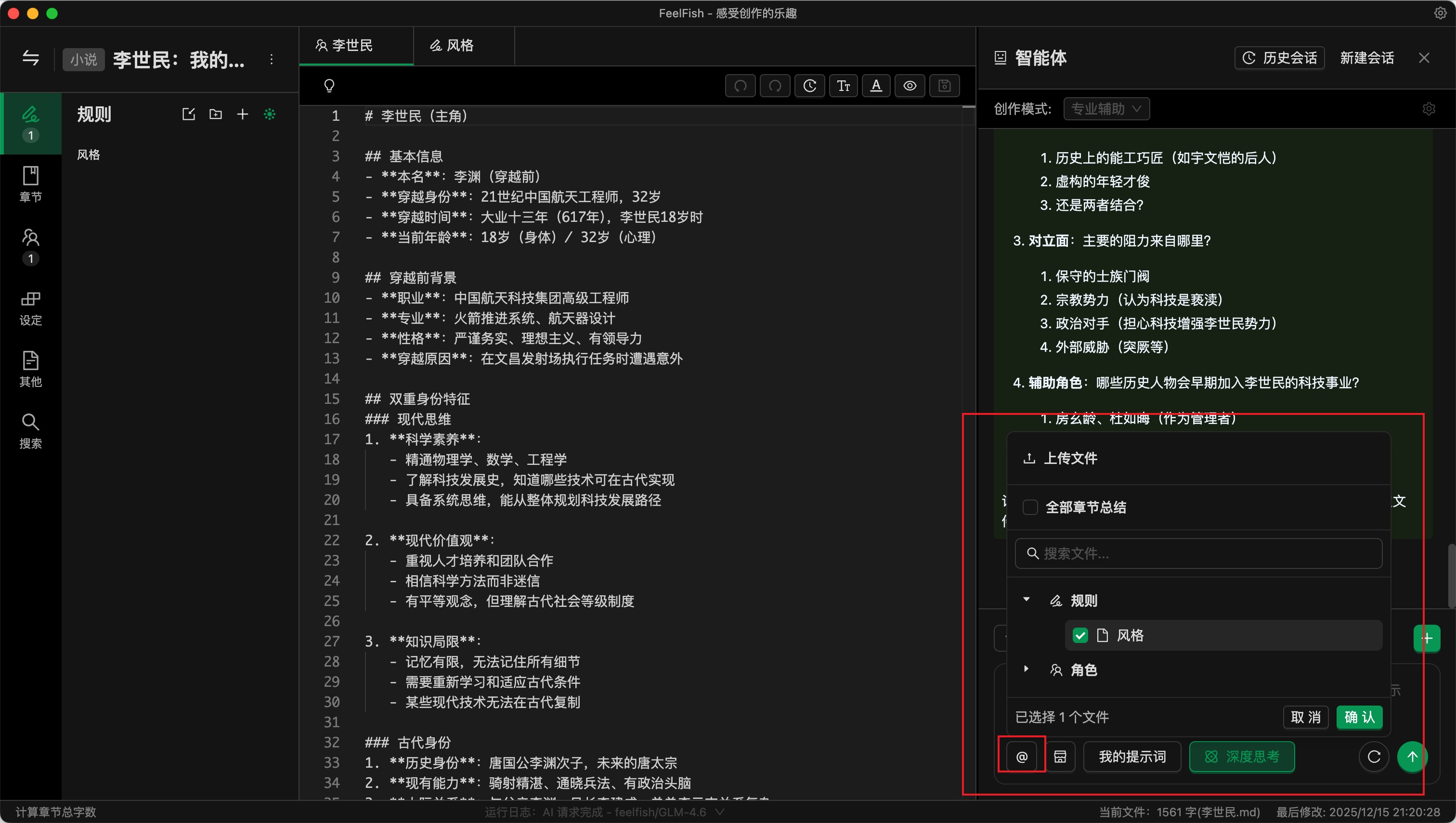 如下图所示(需要更新 FeelFish 到 2.10.0 版本以上),你也可以在 FeelFish 手动添加创作规则(可能是风格、也可能是创作引导、大纲等),小说角色,小说设定等信息,帮助你创作出剧情更连贯,更可以表达出创作者创作想法的文字。或者你可以告诉 AI,请参考 XXX 文件创作。附带文件并不是必须的。